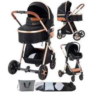 Magic ZC Kinderwagen, 3-in-1-Reisesystem mit Handtasche, bis 15 kg, 0–3 Jahre, erhöhte Sitzposition, mit großem Korb, Schwarz und Gold